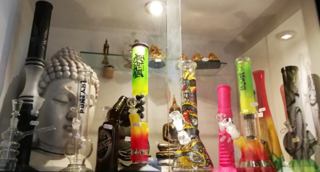 bong in vetro con foglie di cannabis• altezza; 40 centimetri